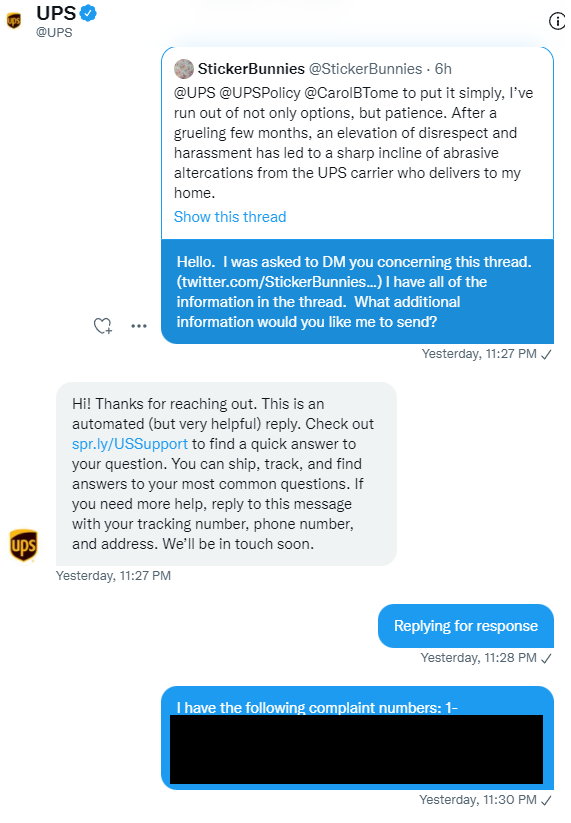 The complaint has been investigated and resolved to the customers satisfaction. This way UPS can say they acted in good faith when faced with a sexual harassment or corporate espionage lawsuit. Your first stop when filing a complaint to UPS is to call Customer Care 1-800-742-5877.